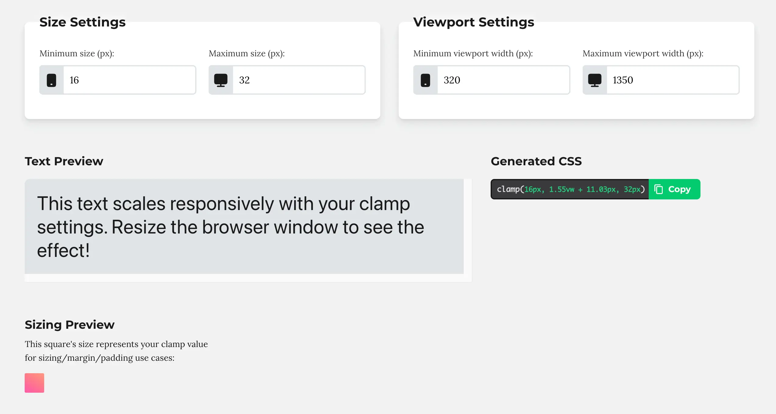 Simple CSS Clamp Calculator - fast, single-value sizing