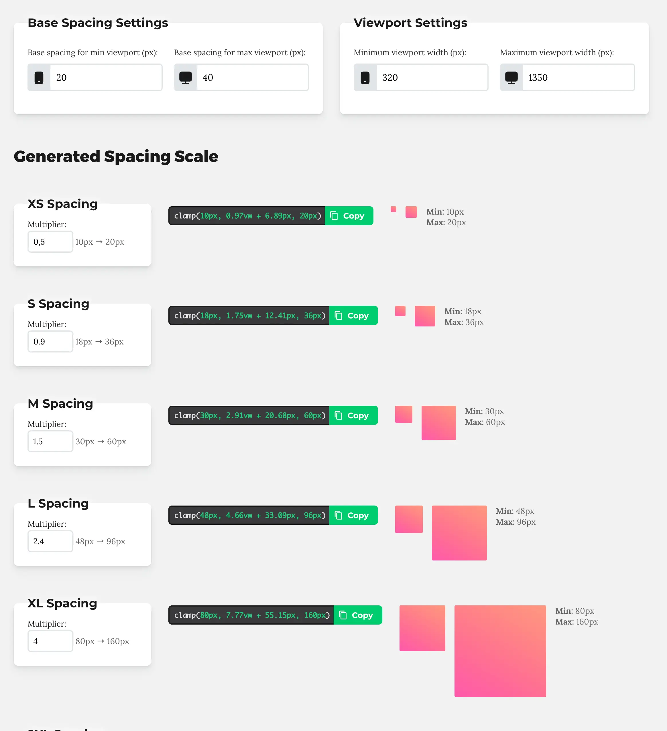 The Spacing Scale Generator applies the same system-based thinking to margins, padding, and gaps. You define a base spacing size and a scale, and the calculator generates fluid clamp values that scale naturally with the viewport.